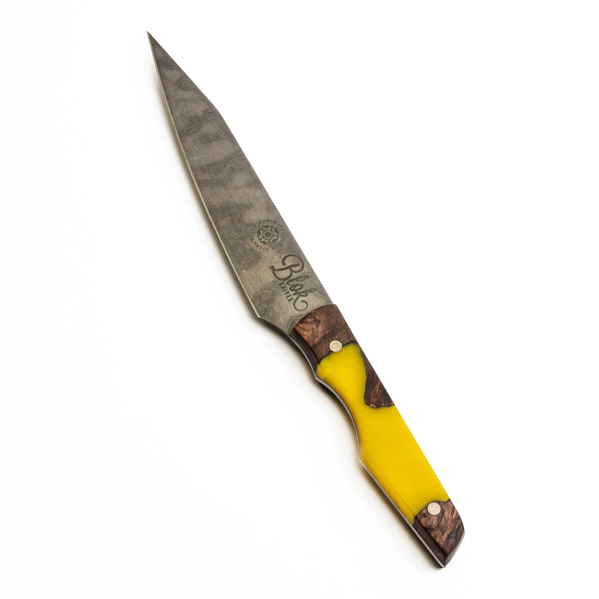 A burl wood & yellow resin handle, carbon steel paring knife that will knock your socks off. This 5" paring knife is a great little all rounder.