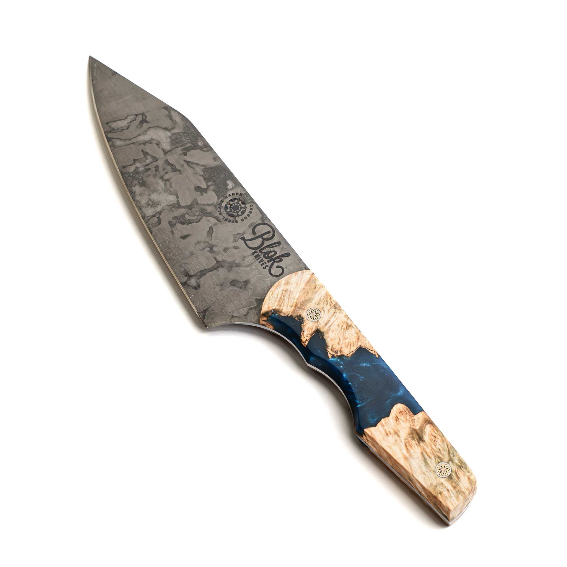 A maple burl and ocean blue hybrid resin, carbon steel utility knife that will knock your socks off. This 6" utility knife is quiet, steady, exact.