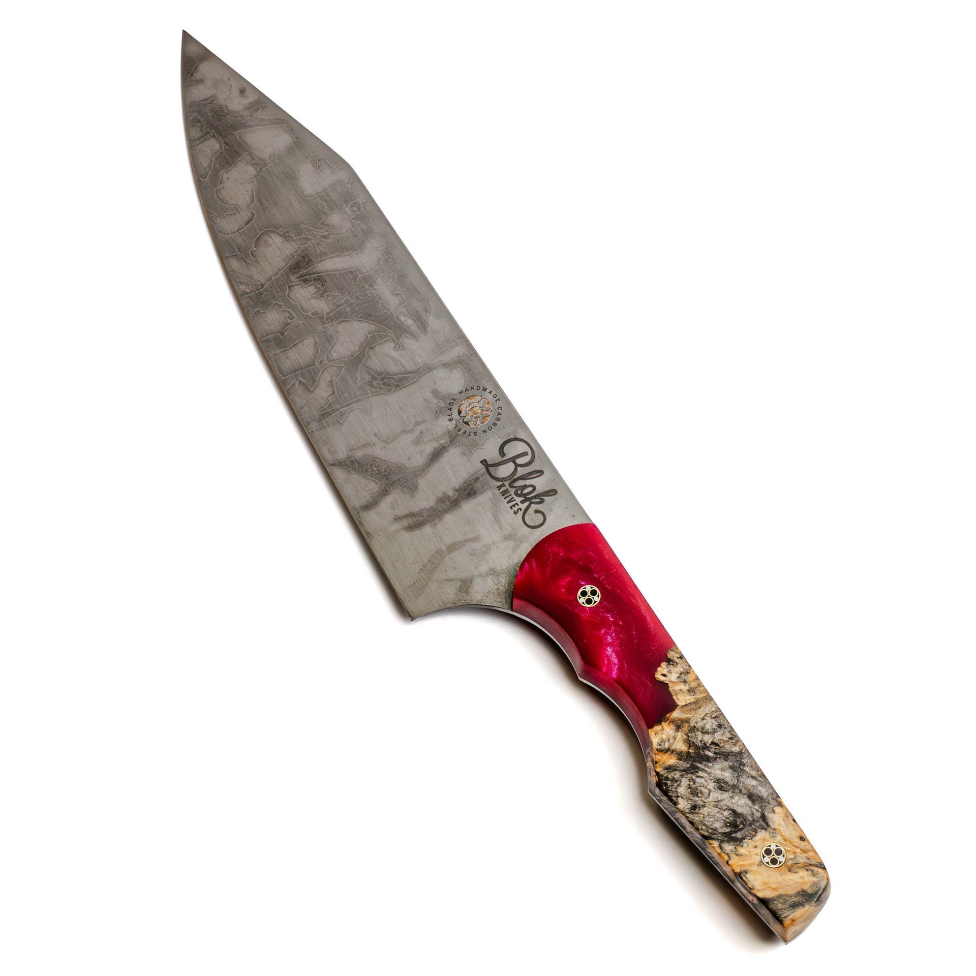 A red hybrid, carbon steel chef knife that will knock your socks off. This 8" slicer is perfect for a hard days graft on the chopping board.