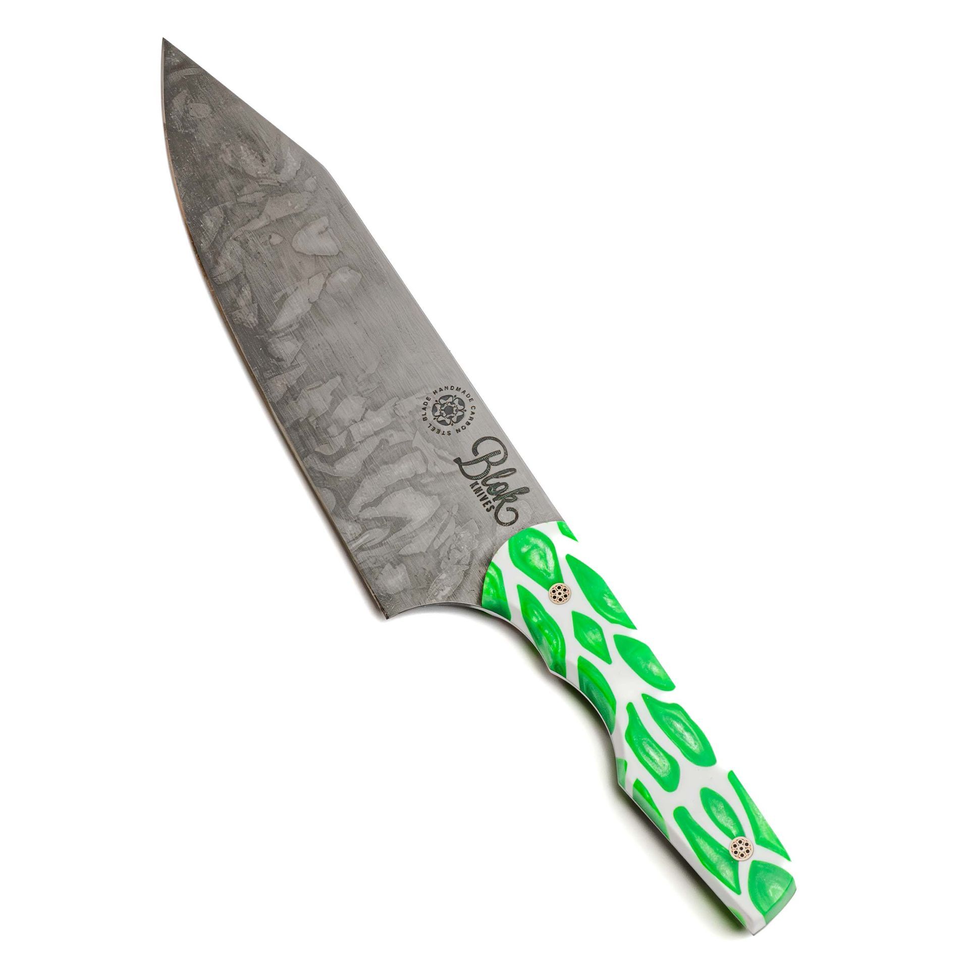 A green resin, carbon steel chef knife that will knock your socks off. This 8" slicer is perfect for a hard days graft on the chopping board.